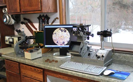 My obsessive/compulsive nature toward the metllurgy of my blades made the ability to look inside the steel a necessity. Martensite is hard and will skate a file, but the same is true of a poor mix of fine pearlite, and the Hardness tester can’t tell you the grain size that is just as important for performance. To meet these needs I have acquired several Olympus metallurgical microscopes over time.